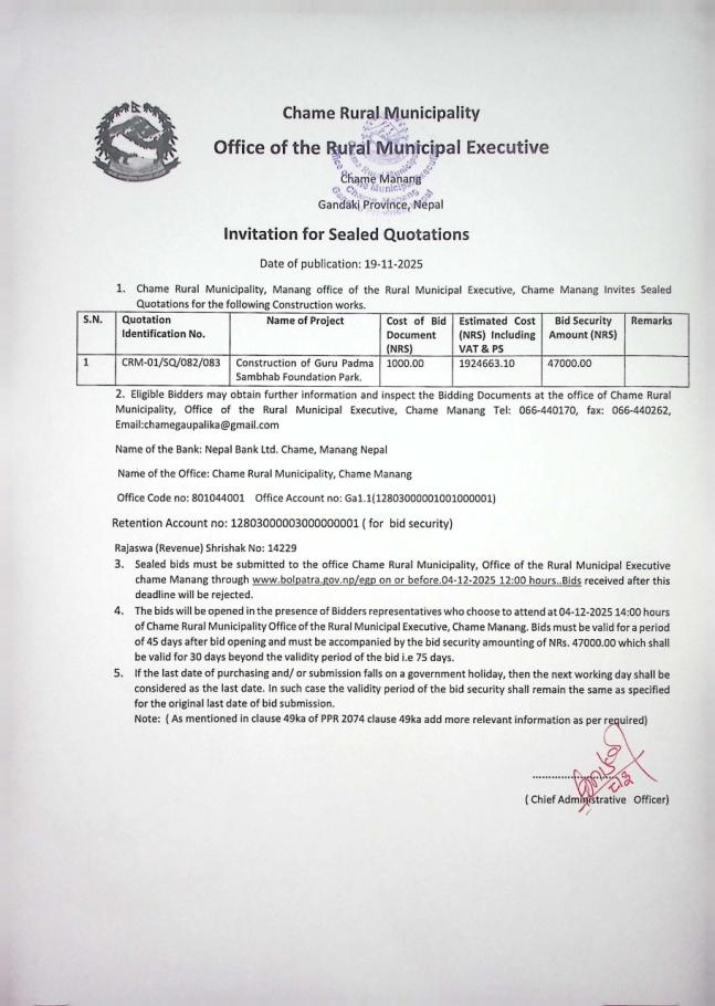 चामे गाउँपालिकाको विधुतिय सिलबन्दी दरभाउपत्र सम्बन्धी सूचना